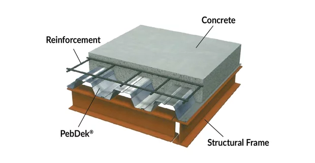PebDek® ត្រូវបានបង្កើតឡើងដោយក្រុមហ៊ុន PEB Steel វាជាប្រភេទដែកពុម្ភដែលត្រូវបានទ្រដោយសសរទ្នឹមដែក។ PebDek® មានតែមួយកំរាស់ 1មីលីម៉ែត្រ ស្រោប galvanized ស្របតាមស្តង់ដារ AS A653 SS Grade 550 & Z180។